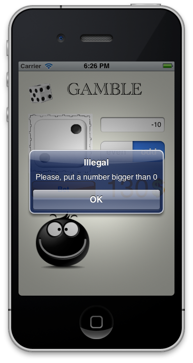 UIAlertView *alert = [[UIAlertView alloc] initWithTitle:@"Illegal" message:@"Please, put a number smaller than your money" delegate:self cancelButtonTitle:@"OK" otherButtonTitles:nil];